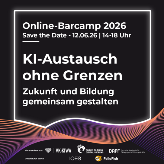 Künstliche Intelligenz (KI) verändert Schule, Hochschule und Gesellschaft grundlegend. Wie gestalten wir diese Transformation gemeinsam? Das Virtuelles Kompetenzzentrum: Künstliche Intelligenz in Bildung, Wissenschaft & Arbeitswelt (VK:KIWA), die Deutsche Akademie für Pädagogische Führungskräfte (DAPF) und das Forum Bildung Digitalisierung laden am 12. Juni 2026 von 14:00 bis 18:00 Uhr zum Online-Barcamp „KI-Austausch ohne Grenzen – Zukunft und Bildung gemeinsam gestalten” ein. Das Barcamp wird unterstützt von IQES und FelloFish.